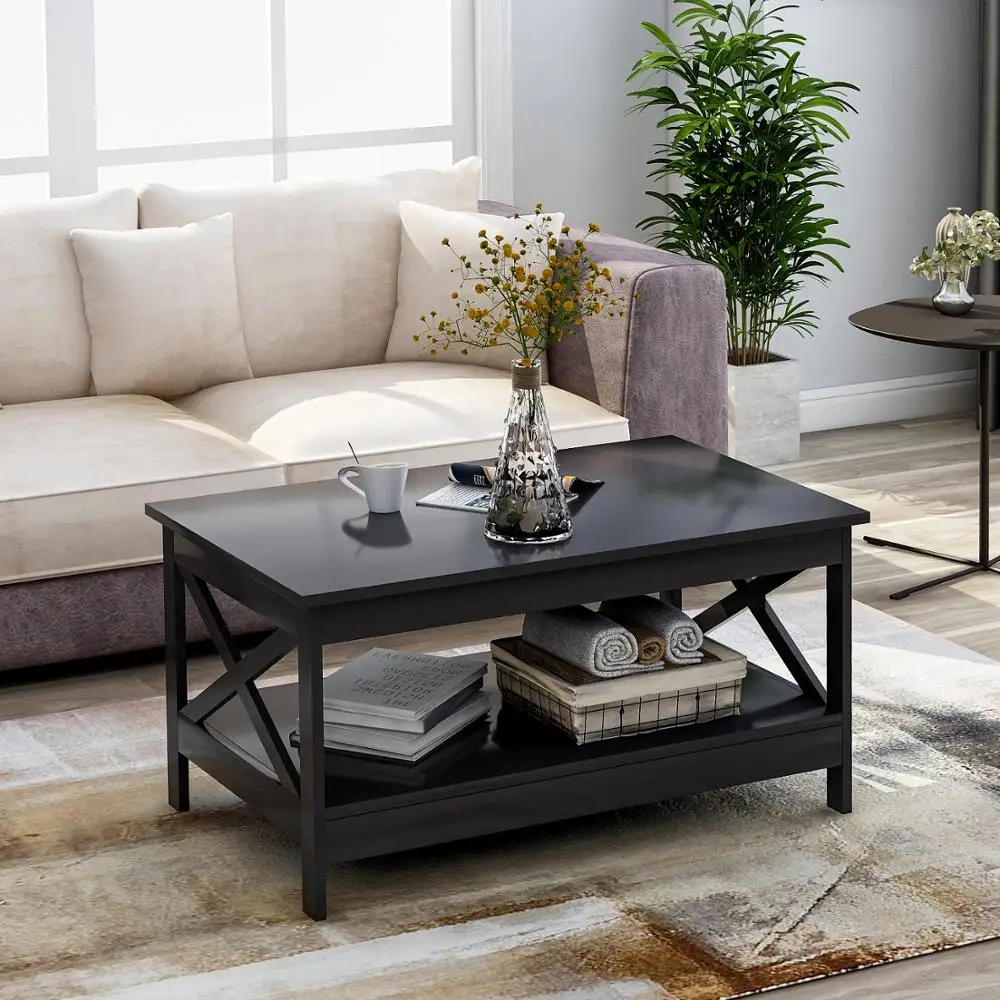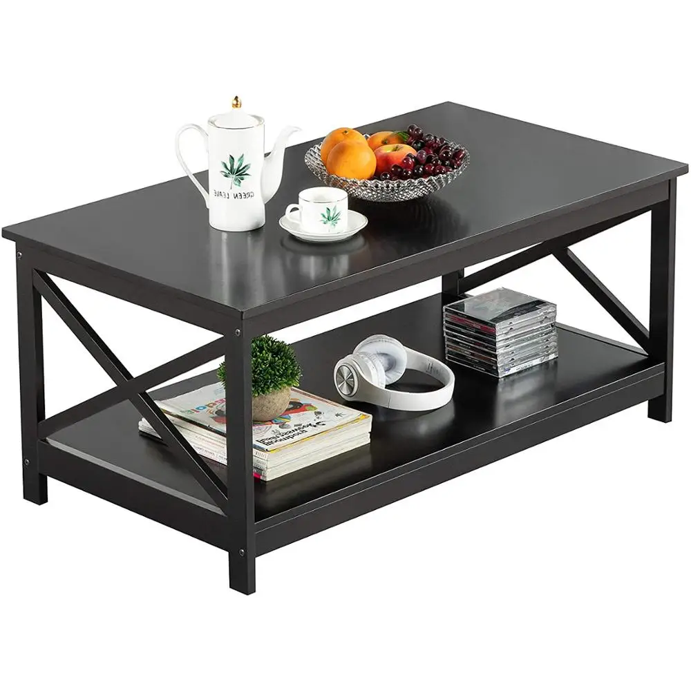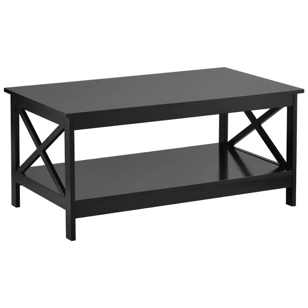Modern Coffee Table for Living Room Wooden Side End Tables Sturdy X Design with Storage Shelf Black Versatile Home Furniture