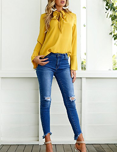 MODETREND Donna Bluse V-collo Bendare Camicetta Camicia Manica Lunga Svasata Shirts Tops Baggy Maglia Cotone Ufficio Aziendale,giallo,M