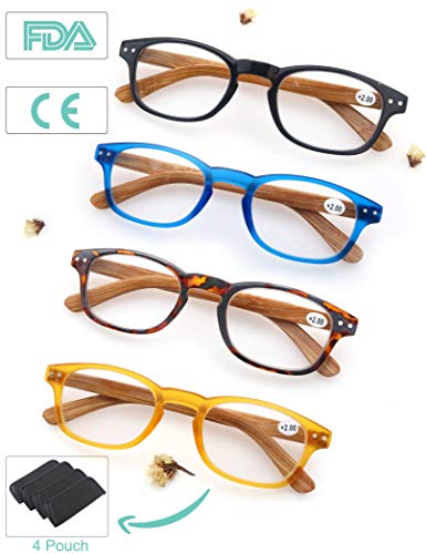 MODFANS Confezione da 4 occhiali da lettura 2.0 per uomo/donna, Cerniera a molla,leggera,effetto legno, lente trasparente con custodia,nero-blu-marrone-giallo
