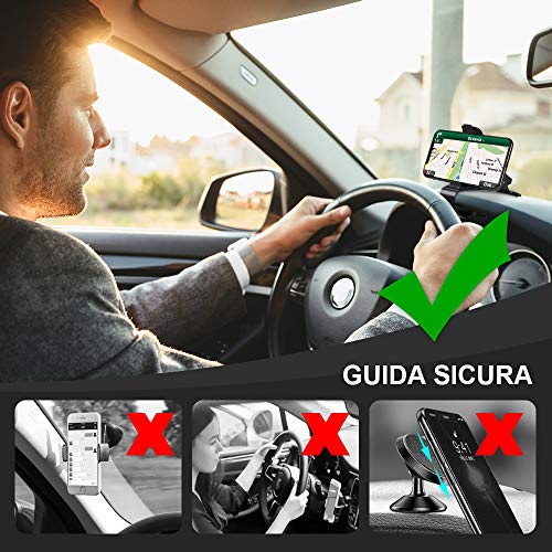 Stabile e durevole: con doppio sistema di fissaggio, assicura stabilità sul cruscotto e evita scivolamenti o cadute. La clip in silicone e la potente molla permette di tenere saldamente il telefono. Materiali di alta qualità, non si deforma, inodore, per un ambiente sano nella tua auto.