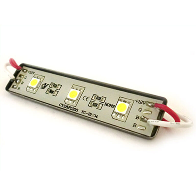 Modulo Mattone LED 3 SMD 5050 Bianco Ghiaccio 12V Impermeabile IP67 UN MODULO con 3 LED SMD grandi "5050" (12V) - Bianco Ghiaccio 6000K - Impermeabile IP67 - INFORMAZIONI UTILI: - Marca: LedLux - Biadesivo 3M incluso - Alimentazione: DC 12V - Basso Consumo, meno di 1W - 3 SMD 5050 - Colorazione: Bianco Ghiaccio (circa 6000K) - Lunga durata 30000 ore - Misura: Lunghezza 76mm;