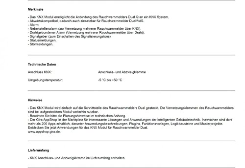Allarme secondario (per la connessione di più rilevatori di fumo tramite KNX). Allarme cablato (collegamento di più rilevatori di fumo tramite filo). Trasmettitore di segnale (per accendere il suono di segnalazione). Notifiche di stato. Dati tecnici. Alimentazione: KNX tramite morsetto di collegamento e di derivazione 0595 00. Intervallo di temperatura: da -5 °C a + °C. 50 °C. Prodotto Tipo di sensori da incasso
