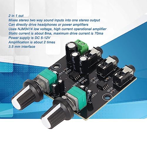2 IN 1 OUT: il modulo della scheda del mixer del segnale stereo mescola gli ingressi bidirezionali stereo in un'uscita stereo, che può pilotare direttamente cuffie o amplificatori di potenza.