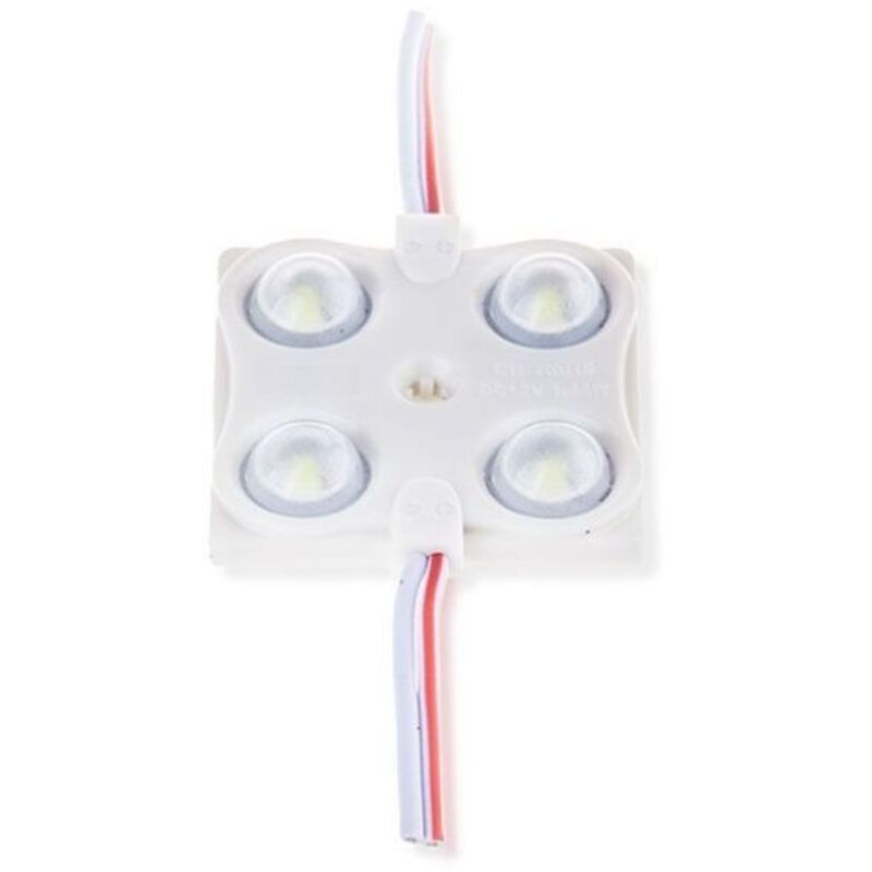 Modulo led stagno 4 led insegna strip led 12volt bianco caldo 1,44 watt struttura in plastica alimentazione 12 volt grado di protezione IP68 apertura fascio luminoso 160° non dimmerabile uso nella realizzazione di insegne o scritte 37 x 37 x 6,8 mm gradazione luce 3000 k lumen 120-135 alimentazione 12 volt DC