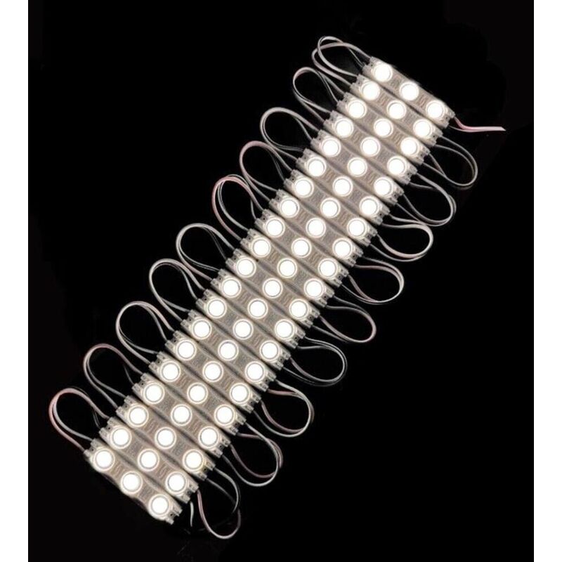 Modulo led 12v 20 strisce per insegne tabelle luce bianca Set da 20 strisce da 3 led cadauna con biadesivo sulla parte posteriore Caratteristiche: Modulo led a risparmio energetico Tipo di led:2835 Alimentazione: DC12V Consumo singolo led 1.2 watt Colore luce 6500K Protezione IP65 Dimensioni singola striscia: 6x1.5 cm