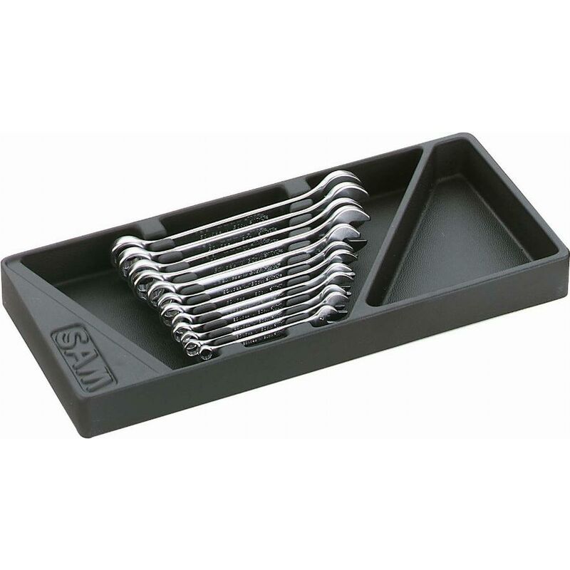 Dettagli: Forgiato in acciaio al cromo vanadio. Combinazione di due teste con la stessa apertura, che consente con la testa a forcella un approccio rapido al serraggio e un bloccaggio superpotente con la testa poligonale la cui curvatura di 15° assicura una facile manipolazione su superfici piane. Forma liscia per il comfort della mano. Finitura cromata lucida al laser. Peso: 1380 g Caratteristiche: Contenitore: Modulo ABS Numero di pezzi: 12
