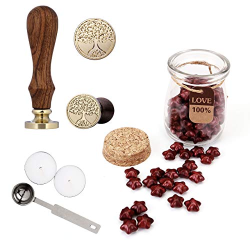 Mogoko, 1 timbro vintage da ceralacca e 120 perline a forma di stella in ceralacca con 1 cucchiaio per sciogliere la ceralacca e 2 candele Life tree
