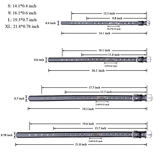 Collare regolabile - S: 26-33cm(targhetta:49*9mm), M:28-36cm(targhetta:52*11mm), L:35-45cm(targhetta:52*14mm), XL:40-45cm(targhetta:52*14mm). Adatti a maggiore parte di cani con varie figure ed età.