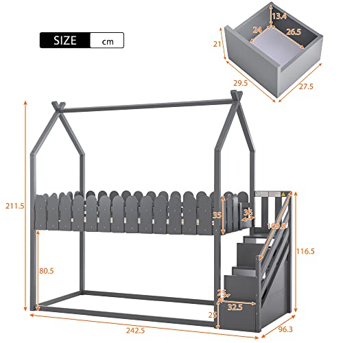 Moimhear Lettino 90 x 200 cm, letto a castello con 3 scale, con 2 cassetti, con recinzione, letto a castello (grigio)