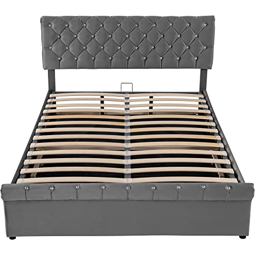 Moimhear Letto matrimoniale 140 x 200 cm, letto imbottito, letto funzionale idraulico, velluto, letto continentale, fibbia di cristallo, testiera regolabile in altezza, grigio (140 x 200 cm)