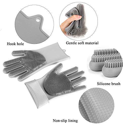 MojiDecor Guanti Silicone Lavapiatti Magici Guanti Spazzola 2 in 1 Resistente al Calore Impermeabile Guanti Cucina Spugna Riutilizzabili per Pulizia Casa Auto Lavaggio Animali Domestici 1 Paio Grigio