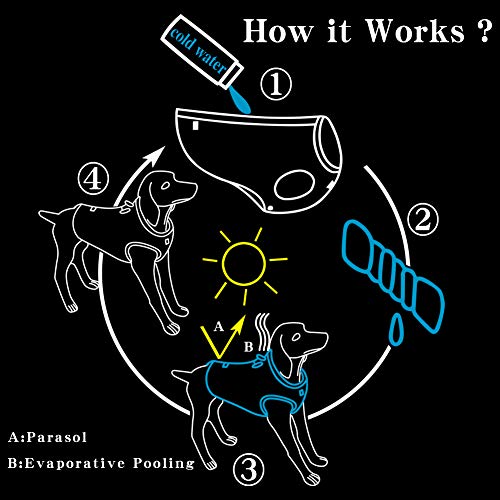 Teoria del raffreddamento: immergerlo in acqua fredda, scriverlo (deve strizzarlo un po 'asciutto) e metterlo sul tuo cucciolo. La teoria del raffreddamento evaporativo sostituisce il calore del cane mentre l'acqua evapora dal serbatoio del cappotto e la temperatura scende dallo strato esterno traspirante, strato interno centrale assorbente e confortevole.