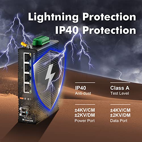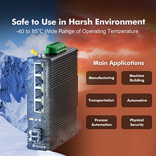 MokerLink Switch di rete industriale su guida DIN a 5 porte Gigabit, 4 Gigabit Ethernet, 1 slot SFP Gigabit con modulo LC 20KM, switch di rete IP40 (da -40 a 185°F), con alimentatore