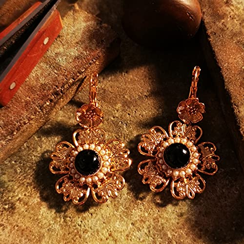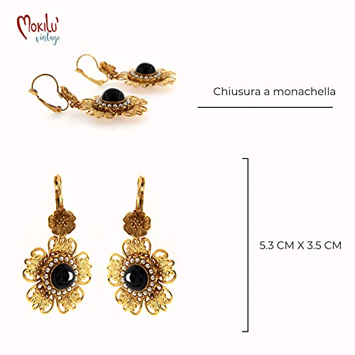 Mokilu' - Gioielli - Orecchini Vintage - Donna - Ottone dorato 24kt - Motivo floreale - Pietra Onice - Perla