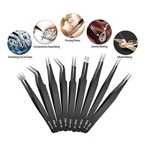 ✅ ' ': 10 pinzette di diverse grandezze specifiche e configurazioni, 1 taglierino di precisione e un sacchetto di stoccaggio per soddisfare le vostre diverse esigenze. Elettronica, lavoro di laboratorio, ecc. Le pinzette professionali sono comode da usare. Rilassa anche con un uso prolungato
