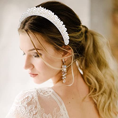 Molain Cerchietti per capelli con perle finte, con nodo bianco e strass, in raso, larghi, spessi, eleganti, per matrimoni, feste di Pasqua, accessori per lo styling dei capelli, per donne e ragazze