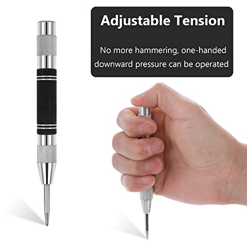 Tensione regolabile: il nostro design del punzone centrale caricato a molla utilizza la tensione della molla che può essere modificata e regolata per marcatura, punzonatura o picchettamento leggeri o pesanti. Cambia la forza del colpo in qualsiasi momento per adattarla alla superficie su cui stai lavorando. Questo punzone industriale ti dà un punto di partenza per il tuo trapano, rendendolo più facile in modo che non scivoli in punti stretti.