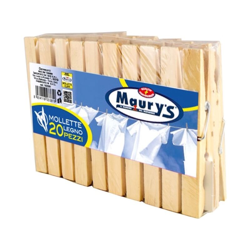 MAURYS MOLLETTE BUCATO IN LEGNO 20PZ Mollette multiuso Materiale: legno e metallo Contiene 20 pz Le mollette Maury's sono resistenti e comode.