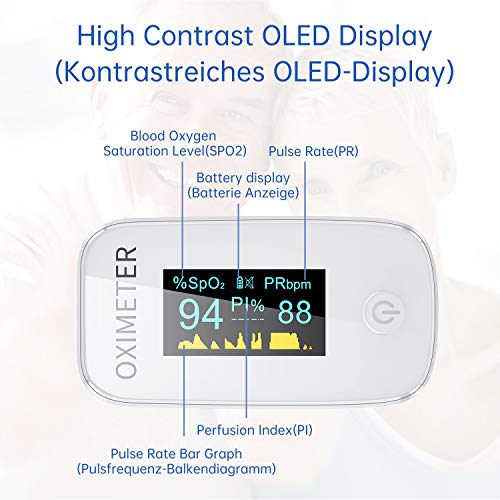Monitoraggio della saturazione dell'ossigeno nel sangue: i livelli di SpO2 o livelli di saturazione dell'ossigeno nel sangue, ti aiutano a capire meglio quanto ossigeno le cellule nel tuo corpo stanno ottenendo. Quando i livelli scendono troppo bassi, scoprite subito con un pulsossimetro digitale.
