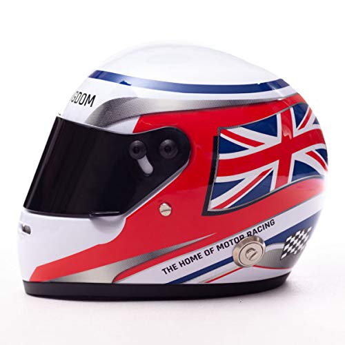 Design e dimensioni perfette: questo elegante mini casco a mezza scala (1:2) è stato prodotto per servire come ricordo della Gran Bretagna Race a Silverstone, la casa delle corse automobilistiche. Il guscio del casco con visiera inclinabile, interno in schiuma e cinturino sono stati decorati con i colori e bandiera dell'Unione del Regno Unito con numero 1 sulla corona.
