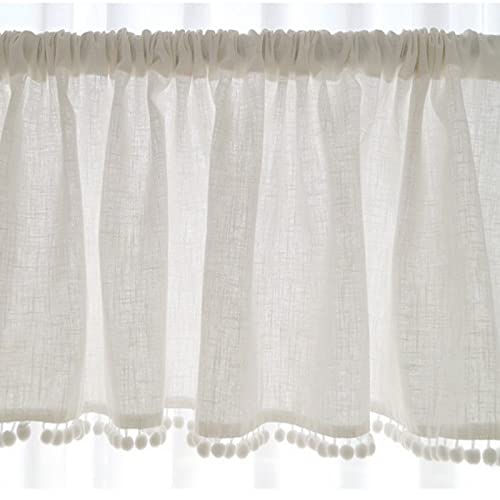A.Monamour Tenda Corta per Finestra Piccola Solido Bianco Lino Cotone Trasparente Con Pompon Nappa Tendina Tenda da Cucina Bistrot Caffè Mezza Tenda Mantovana Tenda a Vetro Tenda a Pannello