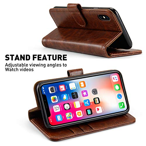 MONASAY Custodia iPhone Xs 5,8 Pollici, Cover iPhone X, Custodia in Pelle Magnetica Libro Flip Antiurto Portafoglio[Supporto Stand][Pellicola Protettiva Gratuita]con Porta Carte, Marrone
