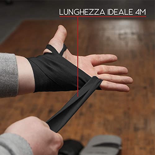 4 METRI DI LUNGHEZZA - Gli artisti marziali esperti conoscono il problema: le bendaggi boxe con una lunghezza di 3,5 metri spesso non sono sufficienti per avvolgere tutte le dita in modo sicuro. Le bende per la boxe con una lunghezza di 4,5 metri di solito devono essere avvolte fino all'avambraccio se si desidera comunque indossare i guanti. Ecco perché le nostre bende sono lunghe 4 metri: la lunghezza ottimale per tutte le comuni tecniche di fasciatura!