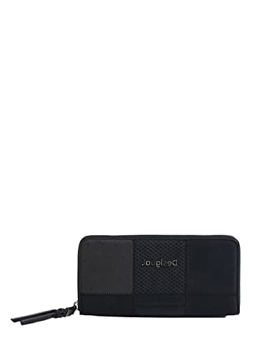 Portafoglio lungo nero con patch di tessuti in finta pelle. Con diversi spazi per monete, banconote e carte. Nuova collezione Accessori AI21 Desigual.
