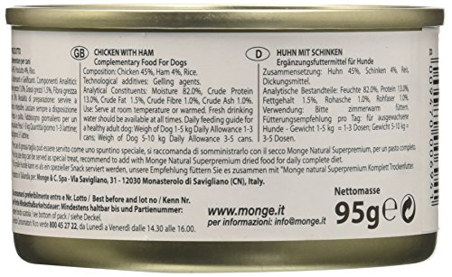 Contenuto della fornitura: Monge Dog ADULT, cibo umido per cani (cibo per cani a base di pollo con prosciutto, alimento complementare, cibo in scatola senza coloranti né conservanti, senza glutine, 95 g).
