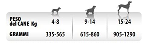 La razione giornaliera può essere suddivisa in due pasti. Adattare le quantità a seconda della taglia, attività e stile di vita dell'animale. Servire a temperatura ambiente. Lasciare sempre a disposizione acqua fresca e pulita. Quando il prodotto va a sostituirne un altro si consiglia di introdurlo gradualmente, in almeno 1 settimana.