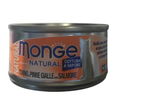 Monge Natural superpremium quality Tonno a pinne gialle con salmone per Gatti, cottura a vapore. Confezione da 24 scatolette (80 gr. l'una). Senza coloranti e conservanti