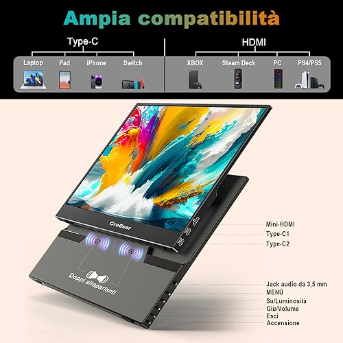 [Ampia compatibilità]: Il monitor portatile da viaggio GreBear è progettato con entrambe le porte Dual Type-C e mini HDMI, che lo rendono compatibile con una vasta gamma di dispositivi, tra cui laptop, PC, Mac, telefoni, XBOX, PS3, 4, 5, Switch e altro ancora. È la scelta ideale per i professionisti, i giocatori e gli appassionati di multimedia che richiedono versatilità in movimento.