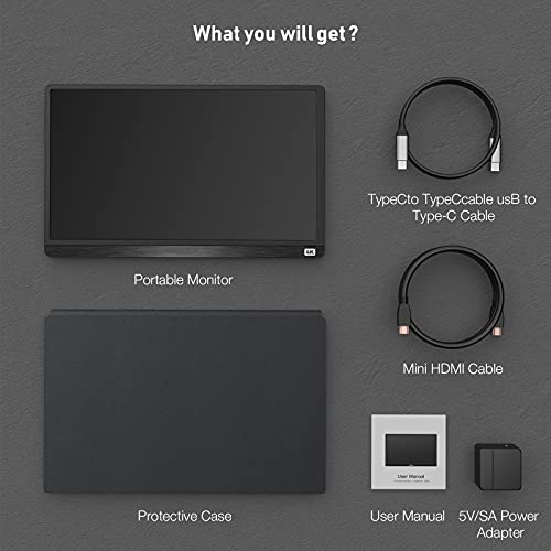 Monitor Portatile 4K, 15,6" Schermo monitor, 3840x2160 UHD USB C Monitor Display IPS con Mini HDMI/Tipo C per Smartphone/Tablet/PC/Laptop PC/Xbox/MacBook [Classe di efficienza energetica A]