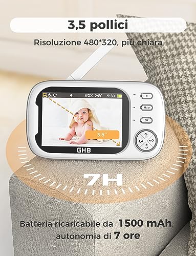 GHB Baby Monitor Video e Audio 3.5'' 720HD Telecamera, 2000mAh Batteria, Comunicazione Bidirezionale,VOX Visione Notturna Visione Monitoraggio Temperatura,Ninne Nanne