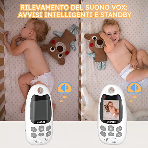 Baby Monitor, Videocamera BOIFUN con schermo da 2.0'' 750mAh Supporto batteria ricaricabile VOX Visione notturna Visione di temperatura 8 ninne nanne per bambino/anziano/animale domestico