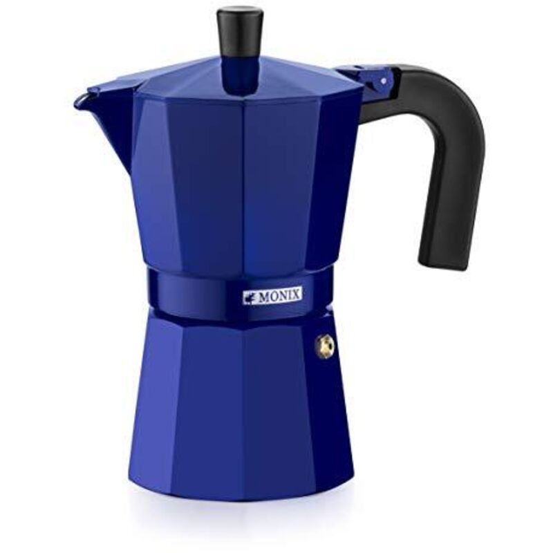 Monix Cobalto Caffettiera italiana in alluminio, misura sei tazze, adatta a tutte le cucine tranne quelle a induzione. Molti sono quelli che hanno rinunciato alle moderne macchine da caffè, anche se gli amanti del buon caffè rimangono fedeli alla classica macchina da caffè italiana. Pertanto, da MONIX non vogliamo perdere l'arte di un buon caffè fatto con la classica caffettiera italiana. La materia prima è fondamentale. Sia il caffè che l'acqua devono essere presi in considerazione e influenzeranno il gusto finale del caffè. Ecco perché si consiglia di utilizzare acqua minerale o acqua filtrata. È conveniente controllare la quantità di acqua da aggiungere, senza stare in piedi o essere breve. Le macchine da caffè MONIX hanno una valvola circolare attraverso la quale la macchina per il caffè lascia fuoriuscire il vapore in eccesso, si consiglia di riempire d'acqua fino a raggiungere il centro. I caffè consigliano di mettere il caffè macinato delicatamente, con piccoli colpi e non