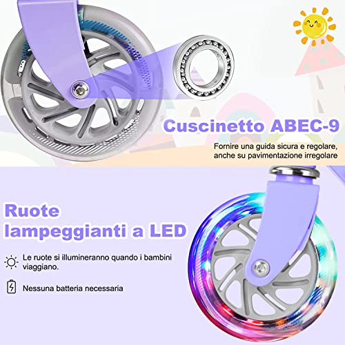 Monopattino per Bambini da 3 a 8 Anni, Monopattino 2 Ruote Luminose a LED, Monopattini con Impugnatura Regolabile in Altezza per Bambino e Bambina e Carico Massimo 50kg (Viola)