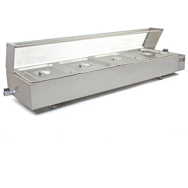 Perfetto per ristoranti, catering, takeaway e café, questo espositore a bagnomaria mantiene il cibo caldo e gustoso come chili, zuppe e fagioli. Il vetro funge da utile vetrina per i clienti e al tempo stesso previene la contaminazione degli alimenti oltre ad essere un ottimo modo per servire il cliente. Il sistema di cottura a bagnomaria utilizza l'acqua per mantenere caldo il cibo ad una consistente temperatura e impedisce ai tuoi piatti di asciugarsi. Caratteristiche: 4 vaschette e coperchi inclusi Ogni vaschetta ospita approssimamente 7 litri di cibo precotto Fatto di acciaio inossidabile Facile da pulire e semplice da usare Rubinetto di scarico a sinistra per drenare l'acqua dopo l'utilizzo Termostato regola la temperatura tra 30° e 85°C Perfetto per mantenere caldo il cibo Dimensioni: 120cm (larghezza) x 35cm (profondità) x 37,5cm (altezza) 24 mesi di garanzia Riponi il tuo delizioso cibo nella vaschetta e lascia che il bagnomaria lo mantenga caldo e gustoso senza seccarlo.