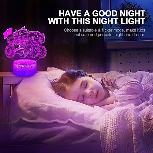 Ottimo regalo di compleanno e Natale per ragazzi: la lampada 3D per monster truck utilizza una luce LED di alta qualità che non si scalda dopo un lungo periodo di lavoro, a basso consumo. La nostra luce notturna monster truck offre una luce morbida e uniforme, non abbagliante, innocua per gli occhi dei bambini, ti consente di goderti un sonno confortevole.