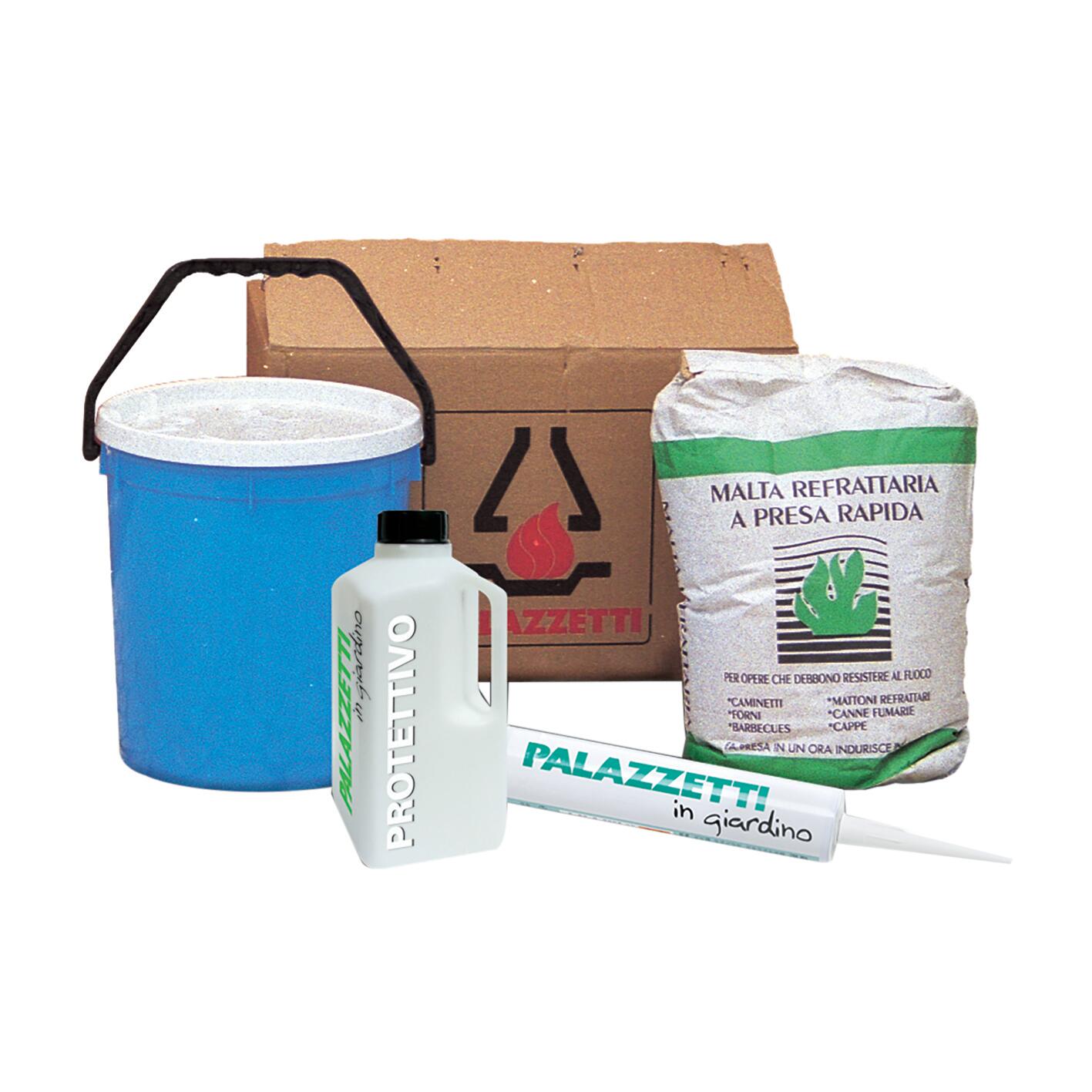 Comprende malta refrattaria per il fissaggio dei basamenti, collante specifico per le parti del focolare, pittura al quarzo per verniciare le parti grezze, 250 ml di protettivo idrorepellente per i piani di lavoro. Ideale per il montaggio e la manutenzione dei barbecue in muratura
