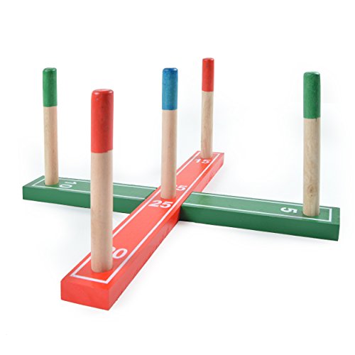 SUPER DIVERTENTE! Per questo gioco di lancio, costituito dalla croce di legno laccata in rosso e verde, nove bastoni da centrare e 4 anelli di corda, è richiesta abilità.