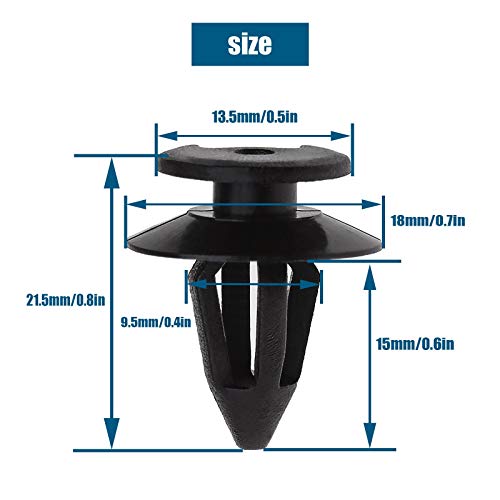 [Dimensioni della clip]: il diametro della testa superiore è di 13,5 mm, il diametro della testa inferiore è di 18 mm, la lunghezza dello stelo è di 15 mm e il diametro dello stelo è di 9,5 mm.