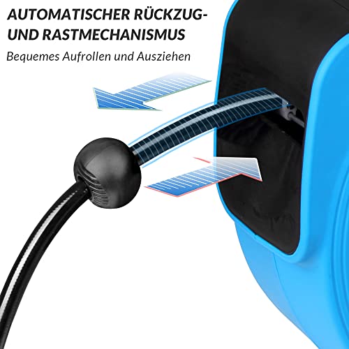 PRATICO: il cavo ha una lunghezza max. di 20 m. Quando non più necessario, basterà tirarlo leggermente e comincerà a riavvolgersi autonomamente. La sfera dui bloccaggio integrata impedisce che il tubo si riavvolga completamente.