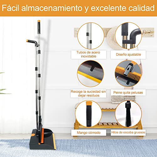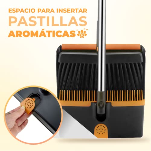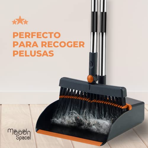 MoodnSpace Scopa e raccoglitore pieghevole con bastone lungo estensibile girevole antispastelli | Raccogliitore spazzatura | Raccogliente apribile e spazzola spazzatrice (nero con arancione)
