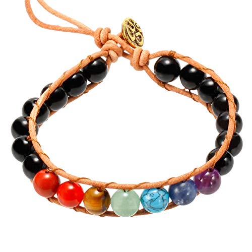 Mookaitedecor - Bracciale con pietra curativa di protezione, per yoga e chakra, in pelle intrecciata, regolabile, per donna e uomo e Fede, colore: 7 Chakra Pierres & Agate Noire, cod. PLAYNUM0005213