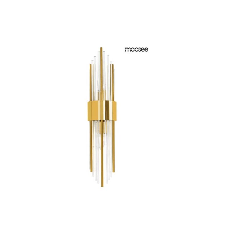 Lampada da parete dorata MOOSEE AMANDA Un moderno apparecchio da parete realizzato con una combinazione di paralumi in vetro e acciaio. L'illuminazione è diretta sia verso l'alto che verso il basso. Il fascio di luce attraversa i paralumi trasparenti e si ferma sui tubi oro-arancio, creando uno straordinario effetto visivo. Luce: 2 x E14 max. 40 W (non incluso) Struttura: altezza 57 cm / larghezza 12 cm / profondità 7 cm Montaggio: altezza 8 cm / larghezza 12 cm Installazione: installazione a parete Peso netto: 1 kg Dimensioni imballo: 64 cm / 17 cm / 11 cm.