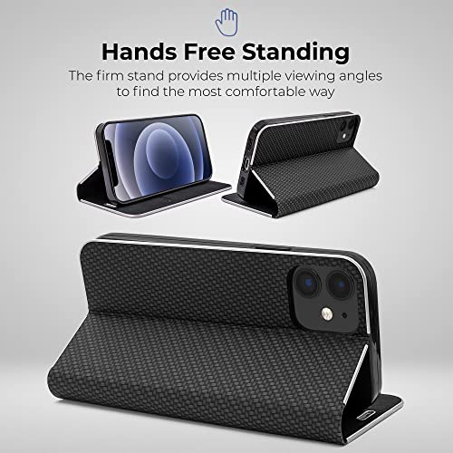 Moozy Custodia a Libro per iPhone 12, iPhone 12 PRO, Carbonio Nera - Protezione dei Bordi Metallici Flip Cover Portafoglio con Appoggio e Porta Carte