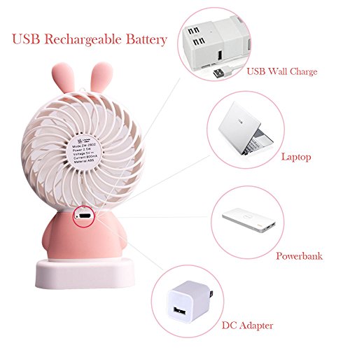 Moppson mini palmare ventilatore, USB a batteria ricaricabile personali scrivania portatile ventola di raffreddamento 2 velocità regolabile, con luce LED e base rimovibile per casa ufficio viaggio campeggio (coniglio rosa)