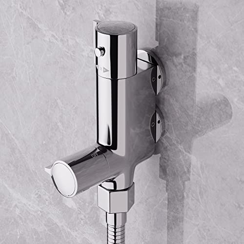 【Materiale Premium】Il miscelatore termostatico per doccia MORADO è realizzato in ottone massiccio ad alto spessore, resistente alle alte temperature e alla pressione, resistente alla corrosione e durevole. La superficie è cromata per garantire l'estetica e la facilità di pulizia.