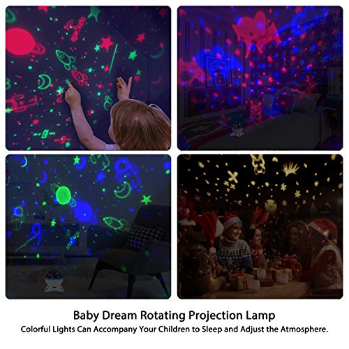 Pianeta /Mondo Animale + 8 Modalità di Luce: ① Ciel stellato: astronauti, pianeti, radar, razzi, stelle e lune. ②Mondo animale mondo: elefanti, conigli, volpi, giraffe, zebre, leoni e cervi. ③ Ci sono 8 colori combinati da rosso, verde, blu ecc, può passare secondo le preferenze. ④Modalità di luce noturna.